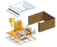 Next in the construction process is building the walls. The trail´s boundary consists of rotated panels shifting from opened to enclosed sections. The panels are made of a wooden frame with a woven bamboo layer within them. The walls enclosing the administrative and dialogue spaces are made of rammed earth. The openings on the walls bring an illuminated atmosphere through the rooms.